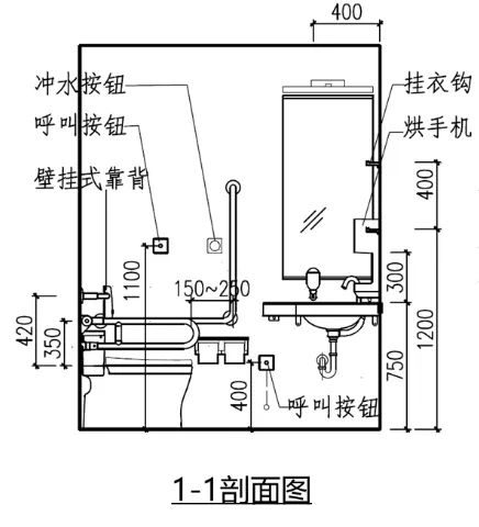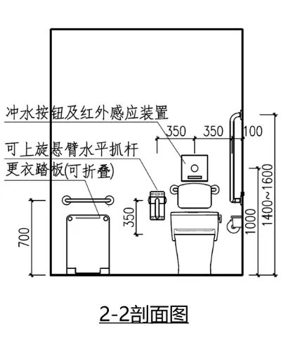 內部應設置無障礙坐便器、無障礙洗手盆、多功能台、低位掛衣鉤和救助呼叫裝置;