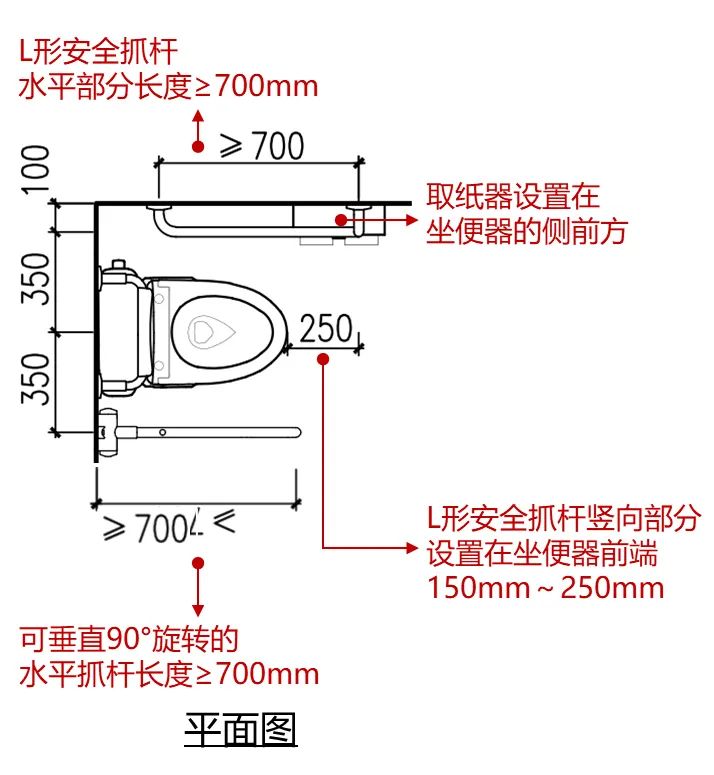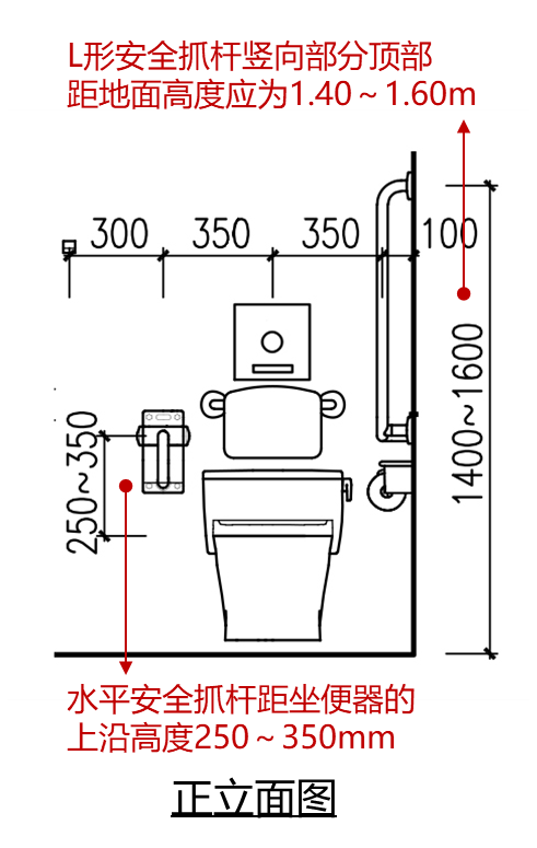 無障礙坐便器另一側設(shè)置的L形安全抓(zhuā)杆,其水平部(bù)分距坐便器的上沿高度應為250mm~350mm,水平部分長度不應小於(yú)700mm;其豎向部分應設(shè)置(zhì)在坐便器前端150mm~250mm,豎(shù)向部分頂部距地麵高度應為1.40~1.60m;