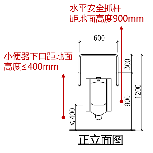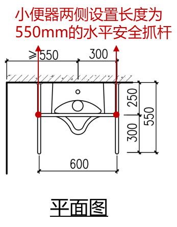 應在小便器兩側設置長度(dù)為550mm的水平安全抓杆,距地麵高度應為900mm;應在小便器(qì)上部設置支撐安全抓杆,距地麵高度應為(wéi)1.20m。